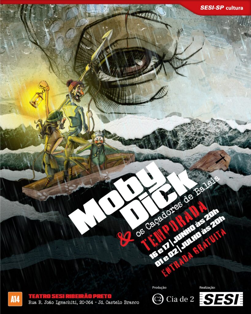 Após conquistar o público em sua estreia no SESI São José dos Campos com todas as sessões lotadas, a Cia de 2 desembarca nesta sexta e sábado (16 e 17/06) no SESI Ribeirão Preto com a comédia Moby Dick & os Caçadores de Baleia, às 20h, com ingressos gratuitos reservados no sistema online Meu SESI. O espetáculo também será apresentado nos dias 1 e 2 de julho, sempre às 20h no mesmo esquema deste final de semana. Apesar de a classificação indicativa ser de 14 anos, crianças acompanhadas pelos pais ou responsáveis têm entrada liberada.
