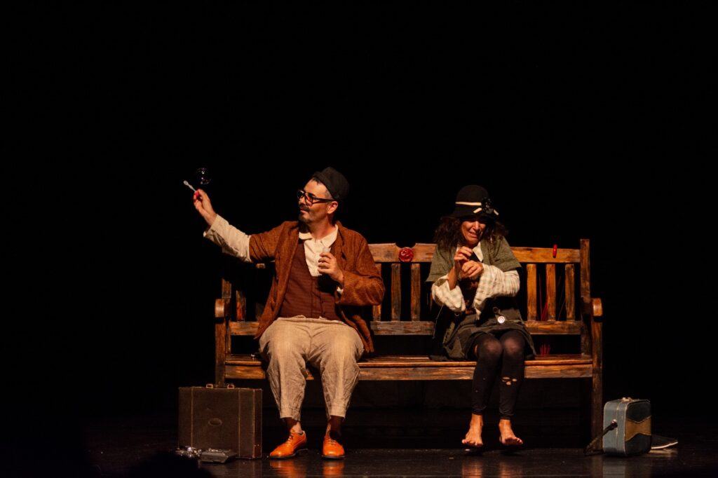 Inspirado na tradição do teatro do absurdo, que tem em Samuel Beckett uma de suas principais referências, “Lesados” constrói sua dramaturgia a partir da repetição, do silêncio e de ações mínimas. Em cena, dois personagens sem nome permanecem em uma estação indefinida, cercados por malas, relógios e objetos cotidianos. A espera – por algo que não se concretiza – estrutura a narrativa e amplia o campo simbólico da encenação.