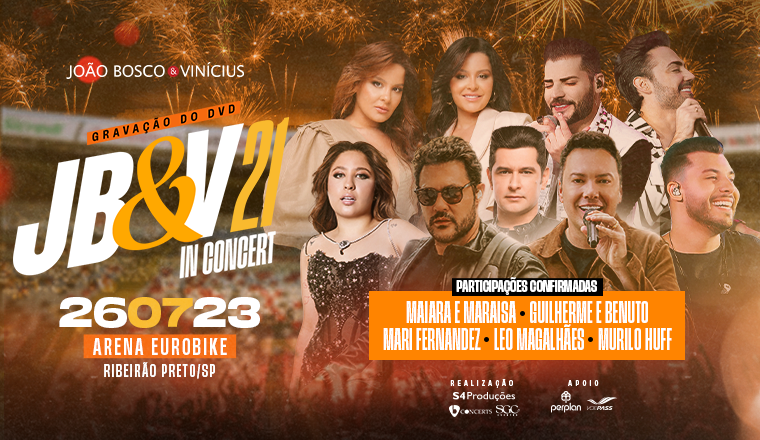 Donos de grandes hits que marcaram a história do sertanejo universitário, João Bosco & Vinícius já atingiu mais de 1 bilhão de visualizações em seu canal do Youtube e tem mais de 3 milhões de ouvintes mensais só no Spotify. Agora, a dupla se prepara para a gravação do seu novo DVD em comemoração aos 21 anos de carreira nacional. Com uma mega estrutura, cerca de 12 mil pessoas esperadas e participações de grandes nomes, como: Guilherme & Benuto, Léo Magalhães, Maiara & Maraisa, Mari Fernandez e Murilo Huff, o projeto promete ser o maior da história dos sertanejos.