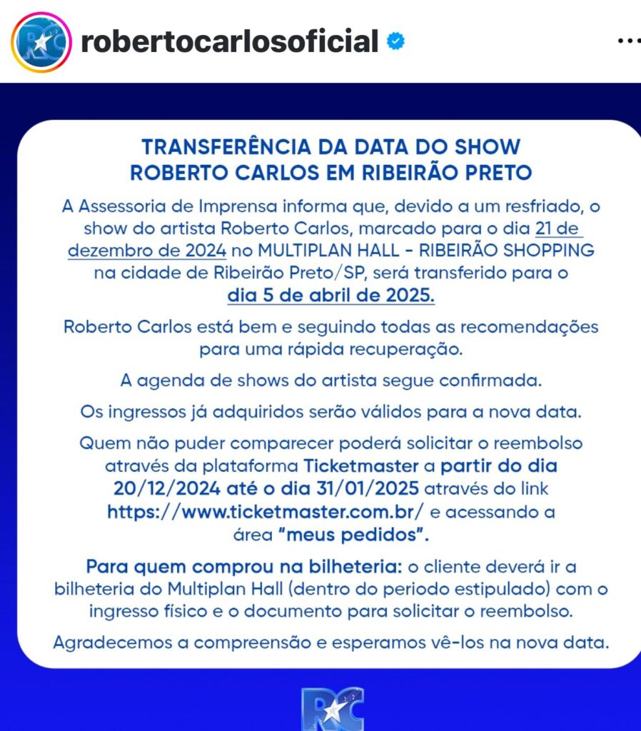 O show do cantor Roberto Carlos, marcado para acontecer nesse sábado, 21, no Multiplan Hall do RibeirãoShopping, foi adiado para o dia 5 de abril do ano que vem. Segundo a assessoria do cantor, um resfriado enfrentado pelo artista é o motivo do adiamento.