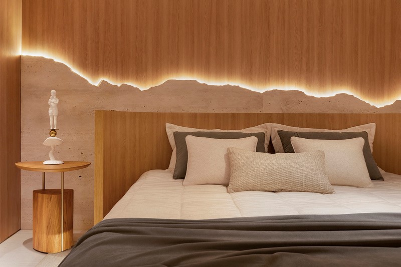 Na “Suíte Navona”, assinada por Thauana Kairala e João Victor Santann, o elemento principal era o mármore. A combinação do travertino navona com o amadeirado conferiu um toque de sofisticação atemporal ao projeto. O uso de spots picco, com uma dimensão bem menor do que os tradicionais, resultou em uma iluminação cenográfica, indireta, intensificando a sensação de aconchego.