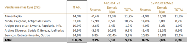 No resultado de vendas mesmas lojas (SSS), a Iguatemi também reporta um excelente resultado tanto no trimestre como no ano. No 4T23, a Companhia registrou crescimento de 9,1% em relação ao mesmo período de 2022, tendo os segmentos de Alimentação e Moda, Calçados e Artigos de Couro como destaque do período, crescendo 11,2% e 10,2% respectivamente sobre o 4T22. No ano, os segmentos que melhor desempenharam foram Serviços, Entretenimento, Outros e Alimentação, apresentando uma evolução de 12,1% e 11,9% sobre o ano de 2022.