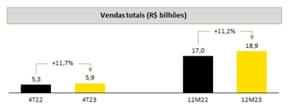 A Iguatemi S.A., uma das maiores companhias full service no setor, com participação em 14 shopping centers, dois premium outlets e quatro torres comerciais, acaba de anunciar a prévia do resultado das vendas totais do seu portfólio no quarto trimestre de 2023. A Companhia apresentou um crescimento em vendas totais de 11,7% no 4T23 versus o mesmo período de 2022, atingindo o recorde de R$ 5,9 bilhões no período. Com esse resultado, a Iguatemi alcançou vendas totais recorde de R$ 18,9 bilhões em 2023 e encerra o ano com crescimento de 11,2% sobre 2022, sendo esse o maior crescimento anual de vendas sem variação de ABL da série histórica da empresa.