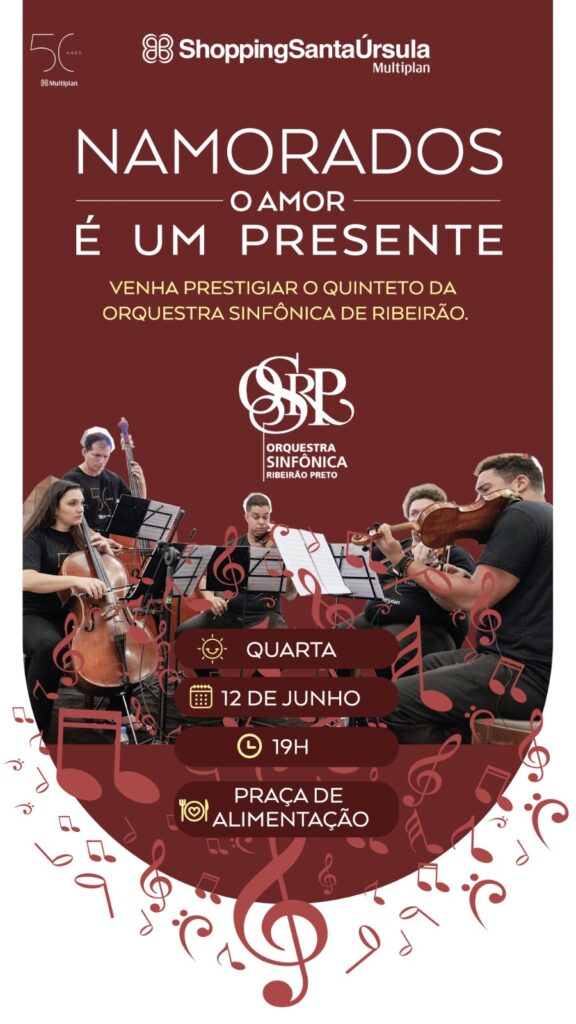 Para tornar o Dia dos Namorados ainda mais especial e romântico, o ShoppingSantaÚrsula promove uma apresentação exclusiva do quinteto de cordas da Orquestra Sinfônica de Ribeirão Preto. O evento acontece no dia 12 de junho, às 19h, na Praça de Alimentação, com entrada gratuita.
