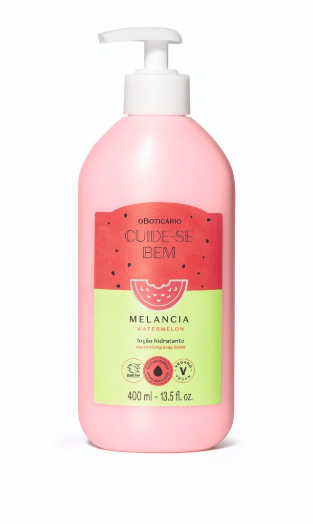 A Loção Melancia possui textura cremosa, extrato da fruta e ativos hidratantes, e uma fragrância energizante de melancia.