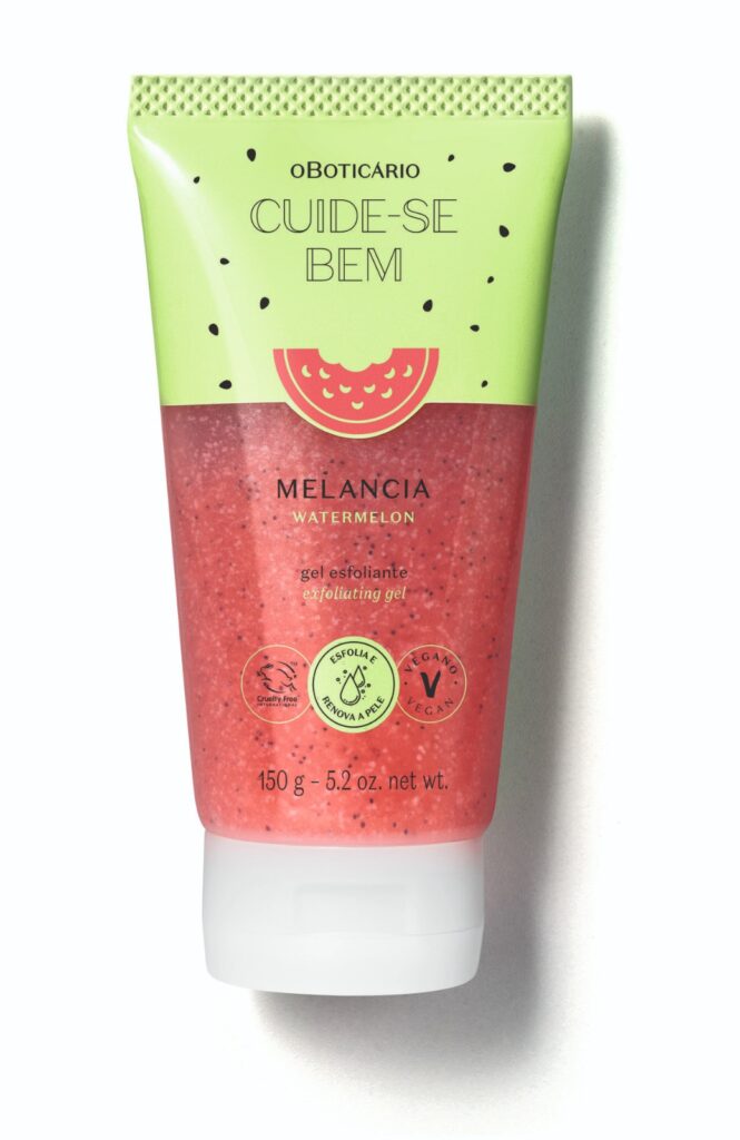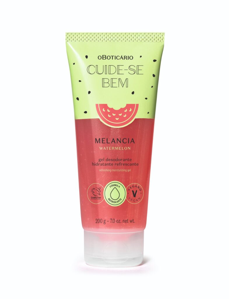 O Gel Melancia possui textura levinha e refrescante, extrato da fruta e ativos hidratantes, e uma fragrância energizante de melancia.