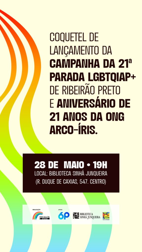 Serviço: 28 de maio – Coquetel de lançamento dos 21 anos da Parada LGBTQIAP+ e comemoração dos 21 anos da ONG Arco-Íris.