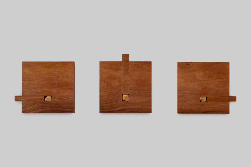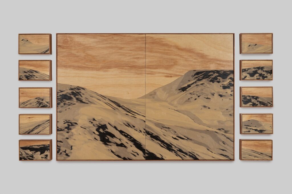 A pesquisa de Aline Moreno transita entre fragmento e totalidade, tensionando escalas entre pedra e montanha. Suas obras articulam pintura sobre madeira, relevos artificiais e composições que multiplicam linhas do horizonte ou reorganizam cortes verticais. “A paisagem permanece presente, mas não se oferece inteira”, comenta.