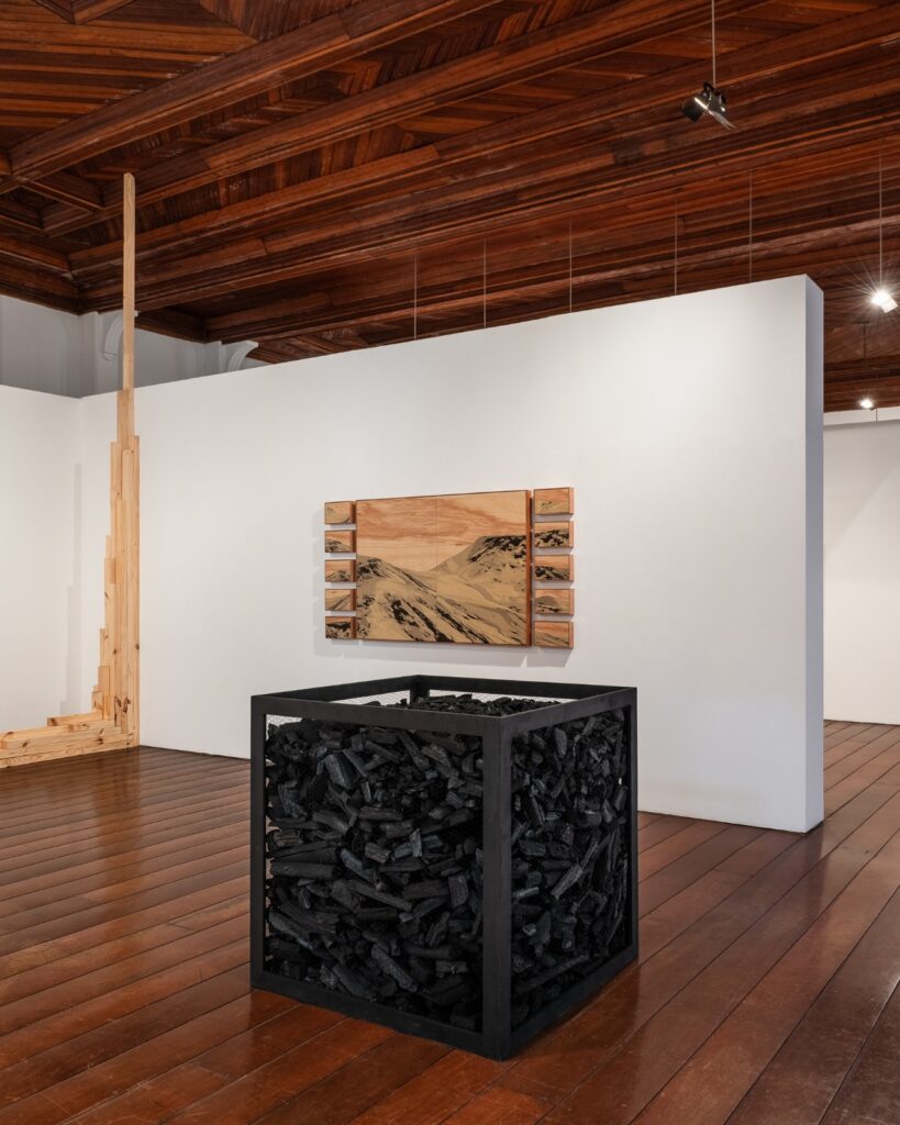 Já Corina Ishikura parte da cartografia, de imagens aéreas e de dados urbanos. Suas pinturas, instalações e vídeo-arte exploram traçados, áreas verdes e ausências que revelam a forma como ocupamos o território. Madeira, carvão e cinzas aparecem como comentário material sobre transformação e impacto humano.