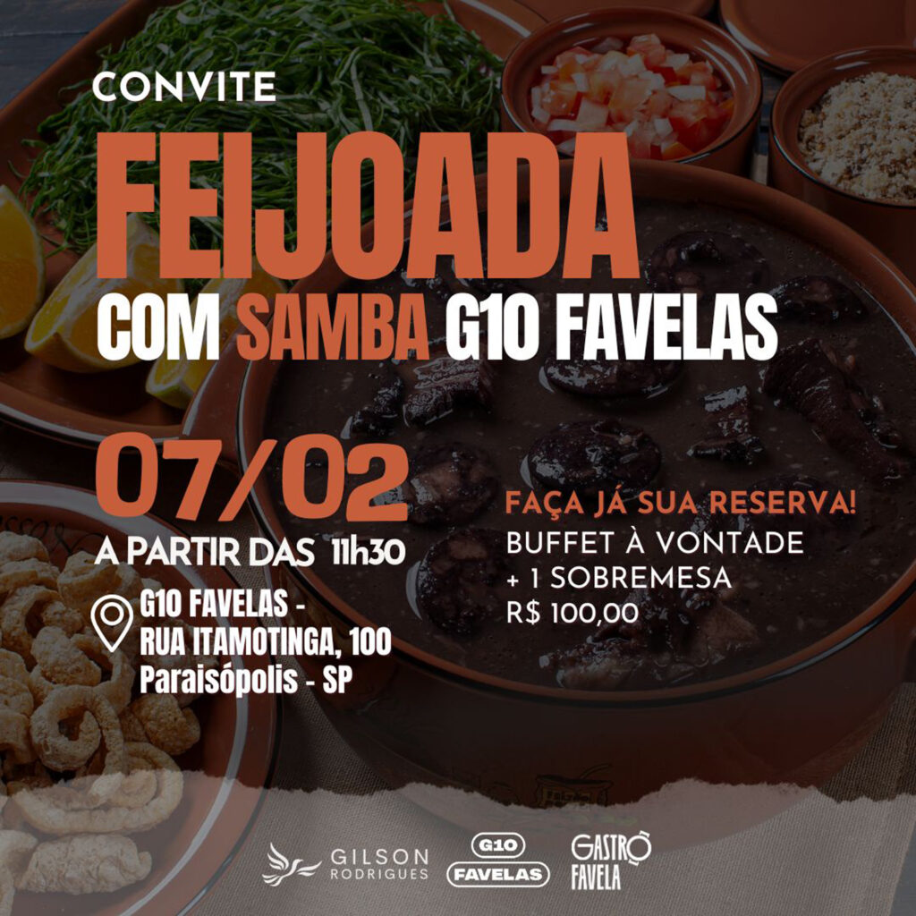 O G10 Favelas realiza neste sábado, 7 de fevereiro, uma programação especial em sua sede, em Paraisópolis, reunindo cultura, gastronomia e empreendedorismo. A partir das 11h30, acontece a tradicional Feijoada com Samba, que celebra a cultura popular e fortalece os laços comunitários, com clima de Carnaval e buffet à vontade, incluindo sobremesa.