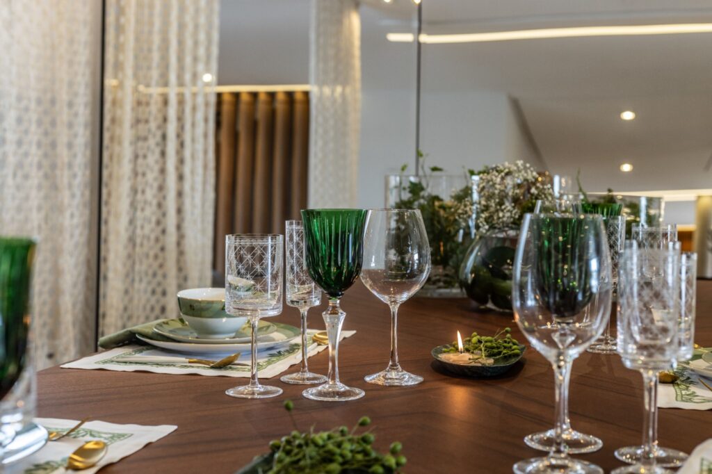 “A mistura de móveis de madeira e decoração nas cores verde, branco e dourado, transmitem sofisticação e aconchego, já o uso de um vaso com folhagens verdes naturais proporciona frescor, enquanto velas promovem uma atmosfera acolhedora. A combinação de elementos modernos e tradicionais na decoração de uma mesa, proporciona um espaço ideal para uma celebração íntima e elegante”, comenta as profissionais Wilnes e Amanda Tortoro.