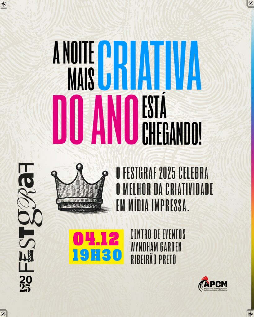 Será anunciado nesta quinta-feira (4) os vencedores do FestGraf 2025 – Festival de Publicidade de Mídia Impressa, realizado pela APCM (Associação de Profissionais de Comunicação e Marketing). Serão revelados os três melhores trabalhos em 15 categorias – já os prêmios Especial 41 Anos e Grand Prix terão apenas um ganhador cada. O evento acontece às 19h30, no Centro de Eventos Wyndham Garden.