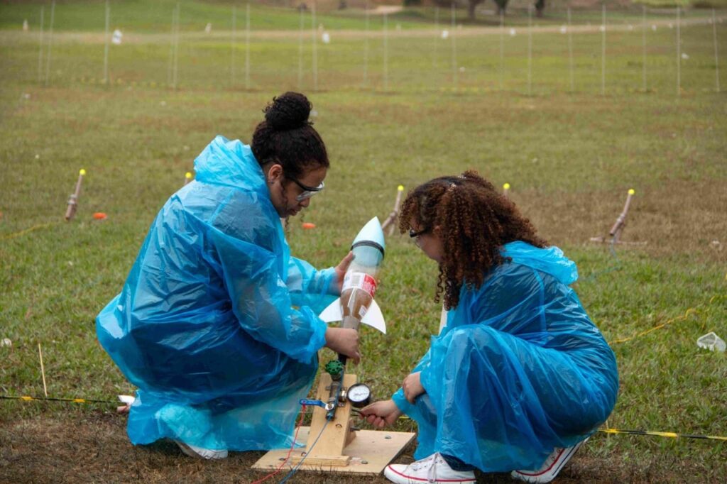 Já o nível 3 é para os matriculados entre o 6º e o 9º, que precisam elaborar e lançar foguetes de garrafa pet movidos com água e ar comprimido. No nível 4, alunos do ensino médio lançam foguetes movidos com vinagre e bicarbonato de sódio. Já no nível 5, alunos do ensino médio ou superior lançam foguetes de propulsão sólida.