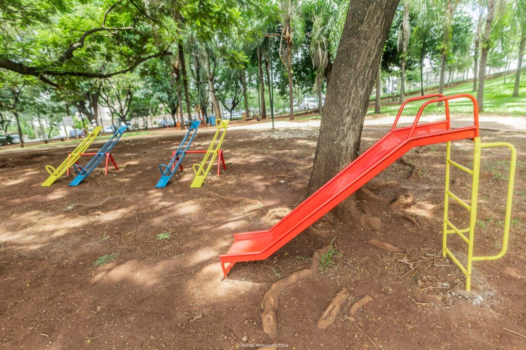 O novo espaço é voltado para crianças de até 10 anos e conta com dois conjuntos completos de brinquedos, incluindo balanços, gangorras, escorregadores e uma gaiola gínica, estrutura metálica para escaladas também conhecida como labirinto ou trepa-trepa. A localização privilegiada, próxima às árvores e ao lago, oferece um ambiente agradável e seguro para as famílias. Além disso, os brinquedos de madeira, já instalados no parque, passaram por manutenção, com nova pintura e reparos, garantindo a durabilidade e o conforto.
